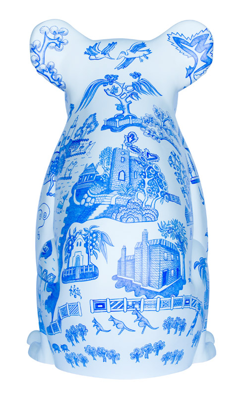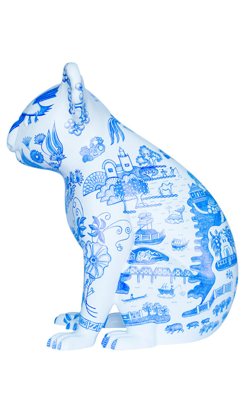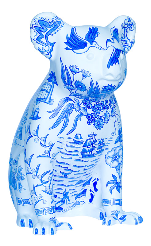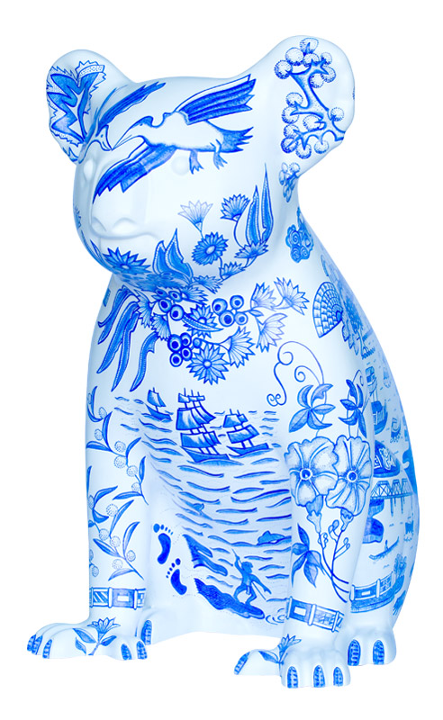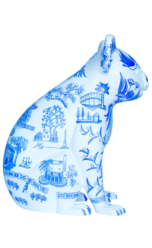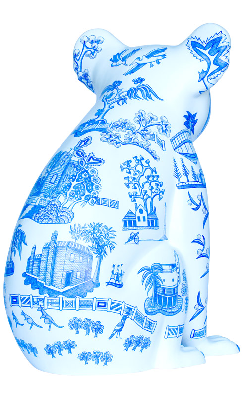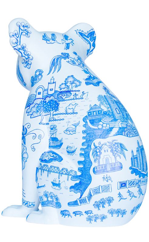 Inspired by traditional Willow Pattern design, Willow Koala includes allegorical imagery of Port Macquarie's heritage & culture. It describes the arrival of the first convicts & settlers aboard The Lady Nelson, Prince Regent, and the Mermaid in 1821; the Birpai fisherman represents the original owners of the land; an early botanical illustration by Annabella (Innes) Boswell (1840s); and, historical and contemporary structures set amongst native flora and fauna. Our heritage and history contribute towards the transformation of the landscape and the uniqueness of the Hastings region.