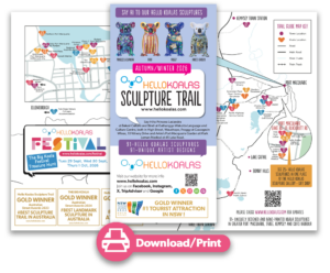 The Hello Koalas Sculpture Trail Guide & Map is freely available at the Hello Koalas Gallery + Gift Shop, The Glasshouse, hotel brochure racks and Hello Koalas sponsor venues.