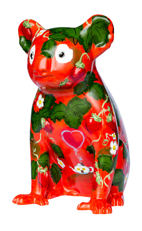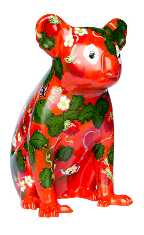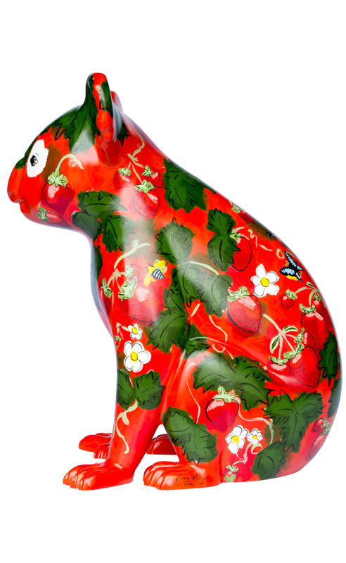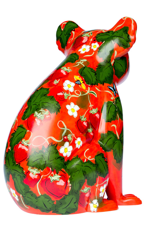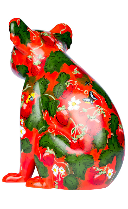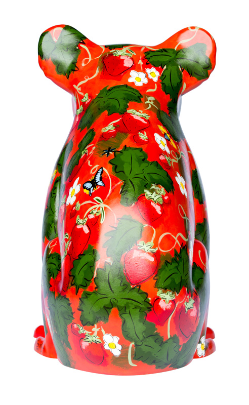 The design is a celebration of luscious, fresh fruit. It is a "berry" delicious strawberry delight! See if you can find some of our local garden helpers - the blue banded bee, the black flower wasp and the blue triangle butterfly.