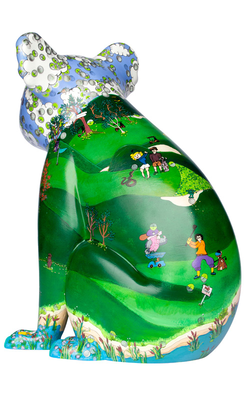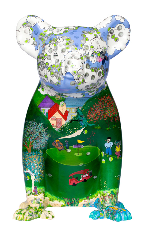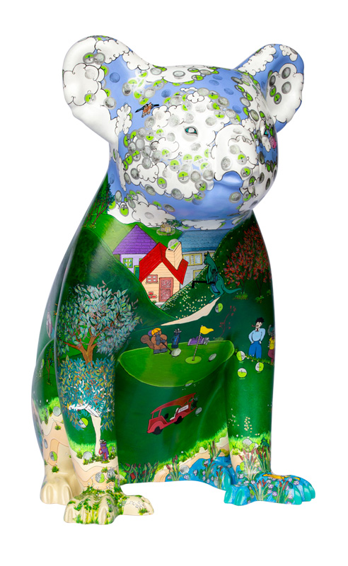 The viewer will no doubt have great fun finding a character that resembles themselves or someone they know. And we all know how hard it is to find that wayward golf ball on a golf course! So try counting the hidden golf balls, you will be amazed by the artists sense of humour. Can you find them all? Send an email with a photo of yourself with Ede Koala and the number of golf balls you’ve counted emeralddowns@bigpond.com
