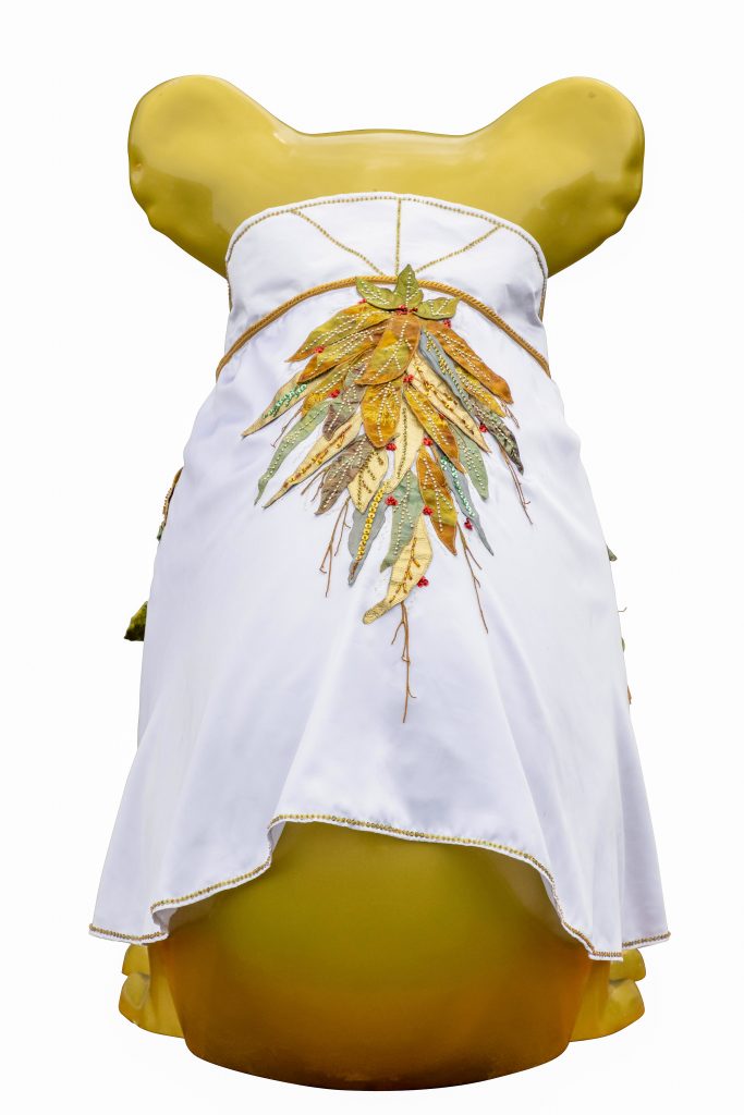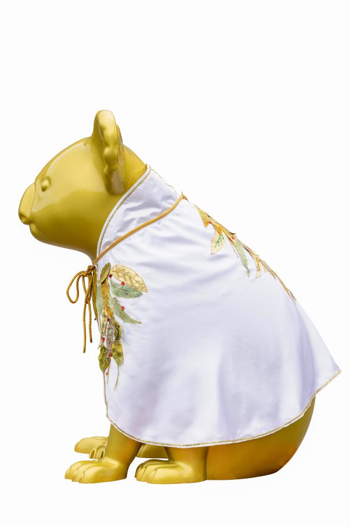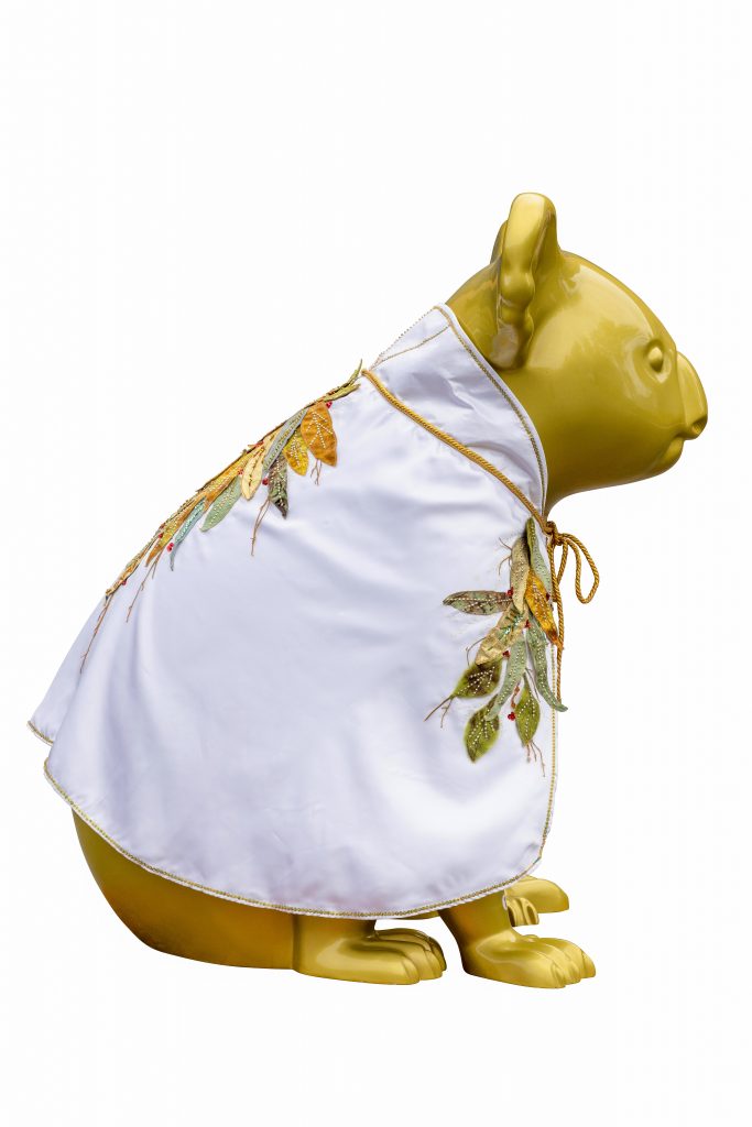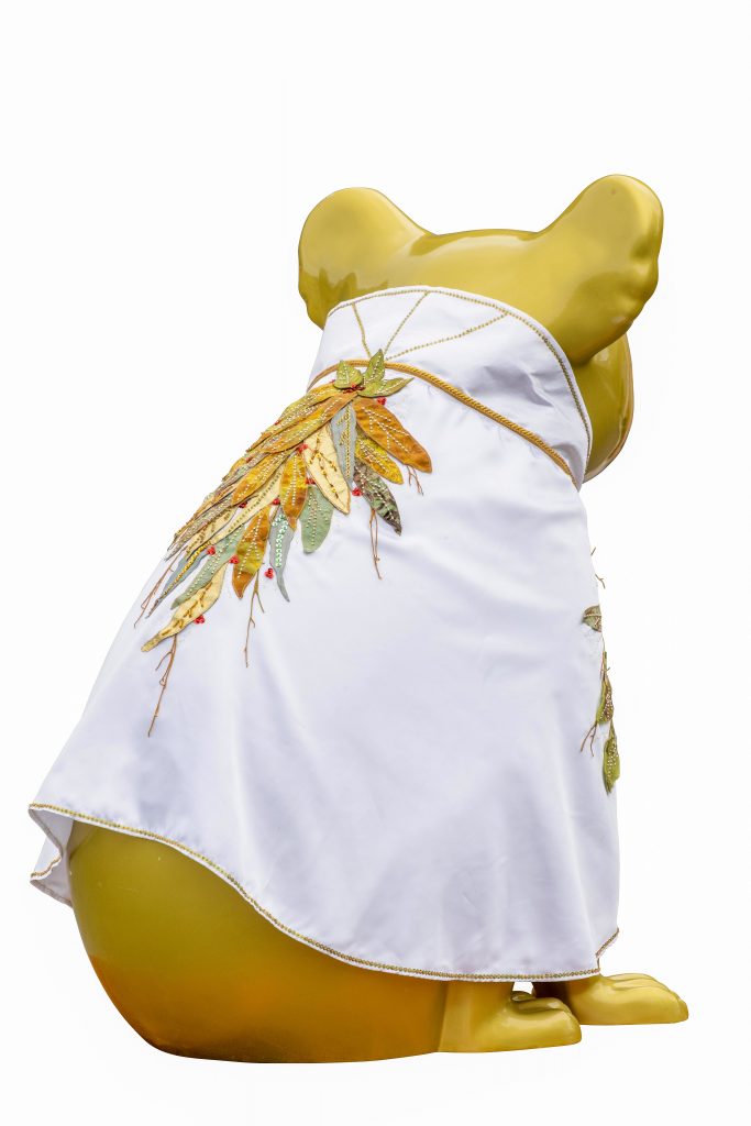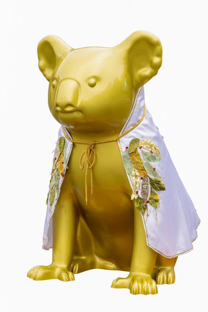 A golden koala radiating warmth and happiness, dressed in an embroidered and beaded cape by local textile artists Carol Toon and Marilyn Ferguson. Elvis stays inside as his cape is too precious to be out in the elements.