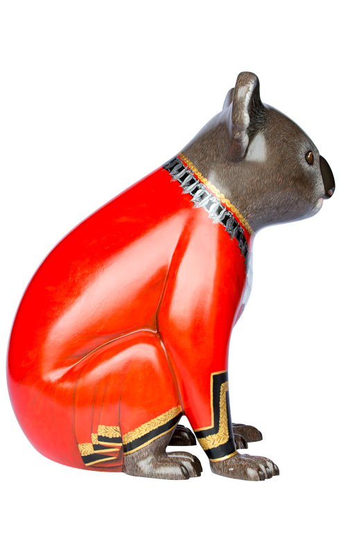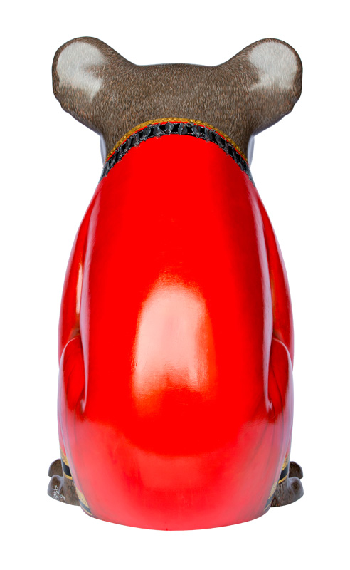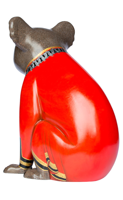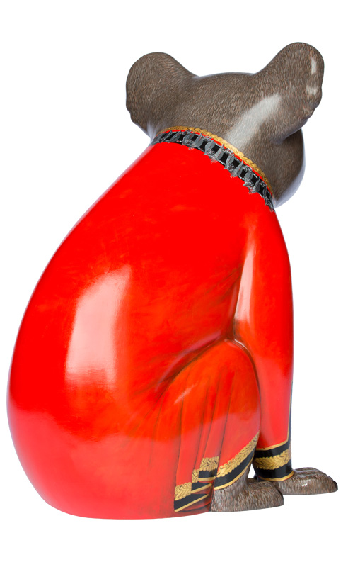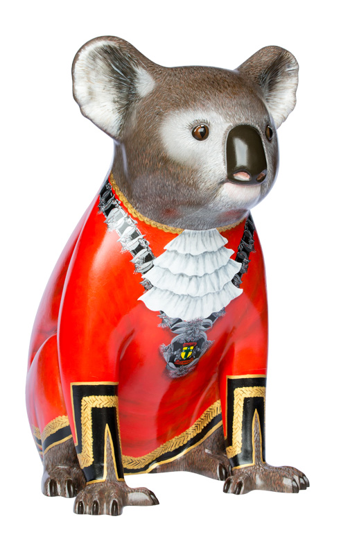 Befitting his rank the Mayor is dressed in his Official Mayoral red robe, but unlike his human counterparts, his robe is trimmed with gold braid not fur. His very important chain of office has been specially designed in silver, carefully depicting the delicate blossoms, leaves and nuts of the Australian Gum Tree.