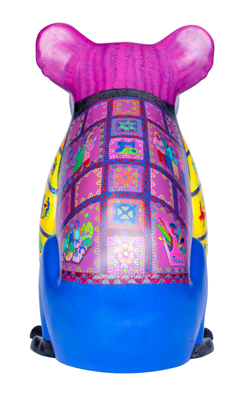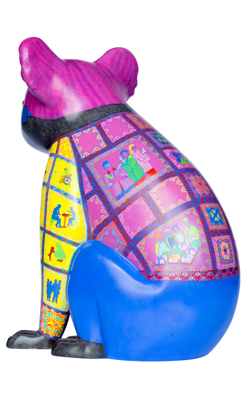 Her colours are designed to invigorate. Crocheting is back in fashion on clothing for our youth, but is also associated with Grannies. The patchwork evokes the patchwork of life’s memories - fun times and doing activities with others. The red/ hot pink lippy, glasses and wrinkles represent lively seniors immersed in life and all it has to offer.